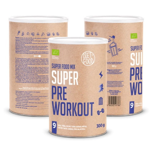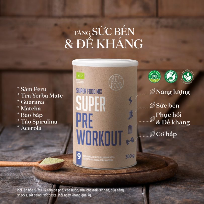 PRE WORKOUT DIET FOOD được làm giàu với các thành phần bột siêu thực phẩm organic như lê ki ma, tảo xoắn spirulna, quả acai, bột quả maca, ca cao, bột quả guarana. Chúng là một nguồn năng lượng tự nhiên vô cùng bổ dưỡng và cung cấp rất nhiều nguyên tố dinh dưỡng cần thiết cho cơ thể hoạt động.
